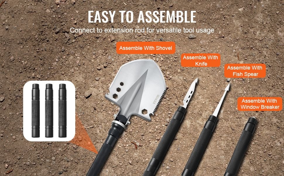 • Screw-On Extension Rods: This portable survival shovel comes with 3 detachable screw-on extension handles, allowing you to adjust the shovel length as needed. The anti-slip thread design provides a stronger grip for better control.
